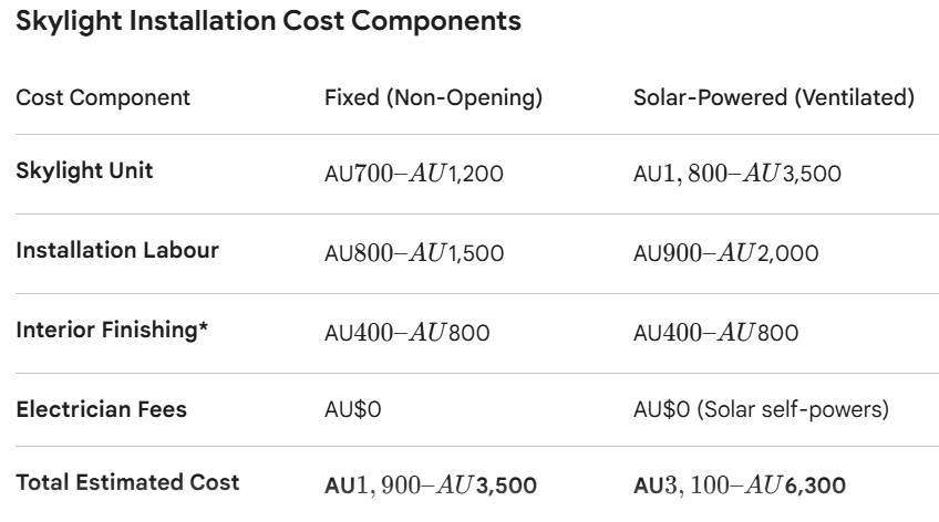 - Fixed Skylight (Medium): AU$2,800 – AU$4,500